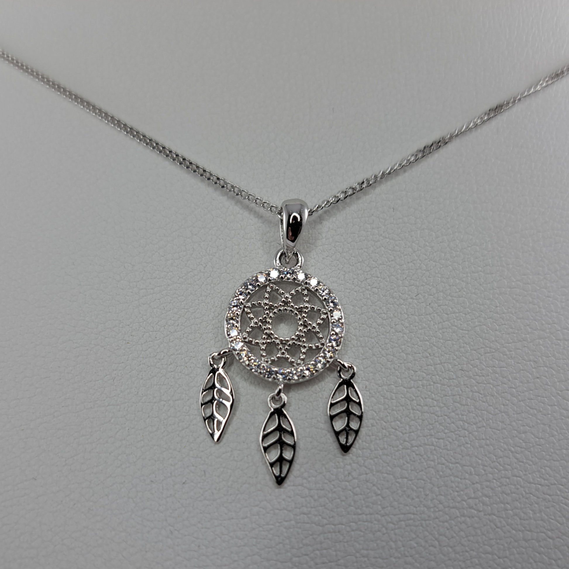 Protect and cherish your dreams with our Sterling Silver Dream Catcher Necklace. Made from sterling silver and rhodium plated, this necklace features a stunning dream catcher pendant embellished with sparkling cubic zirconia stones. With its 18 inch chain and elegant gift box, this necklace makes for a perfect gift. Embrace the enchantment and grace of this timeless accessory.