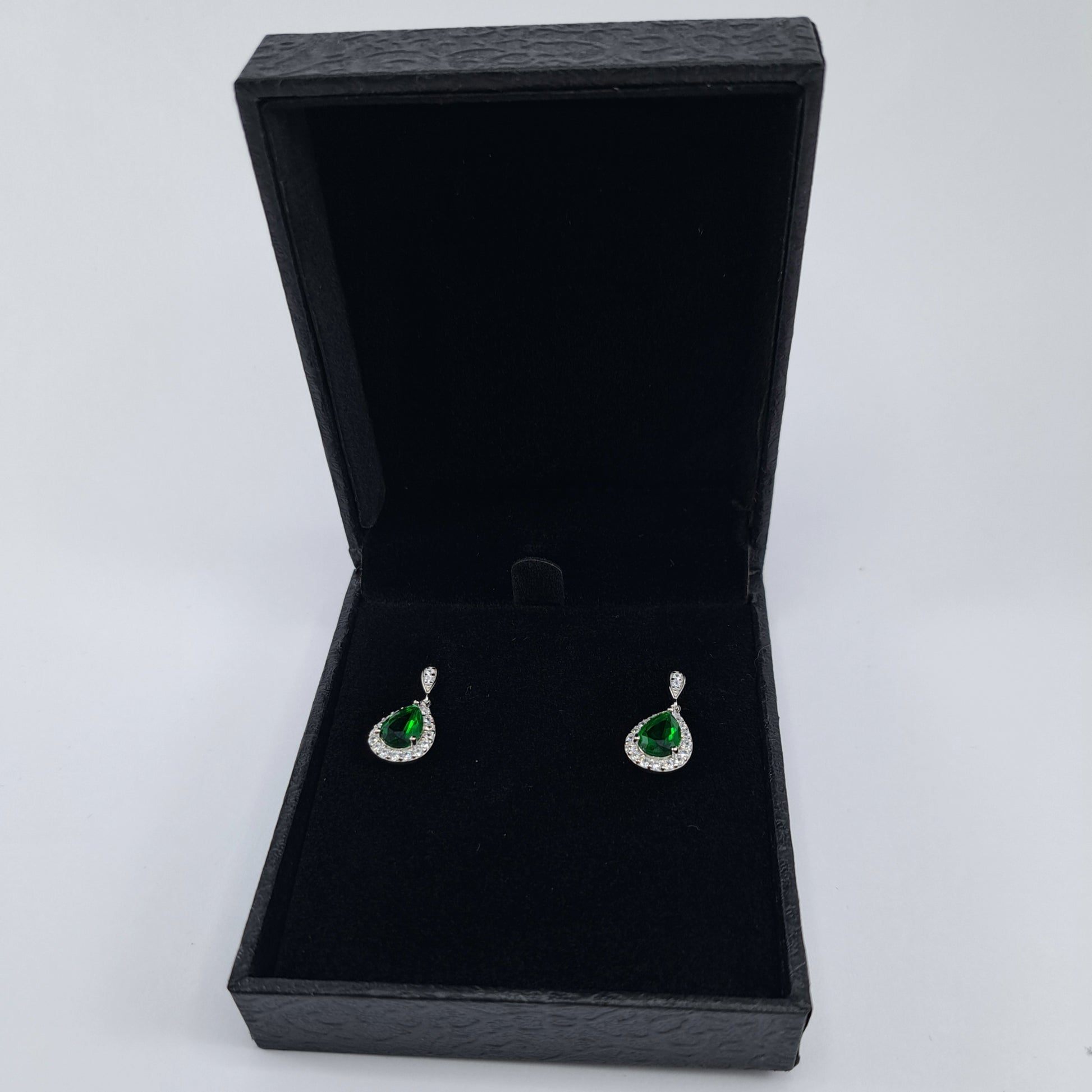 The teardrop shape of these earrings is elegant and versatile, making them suitable for any outfit. The rich, deep green colour of the Emerald stone adds a touch of sophistication and glamour, while the clear stones bring a bright sparkle that catches the light beautifully.